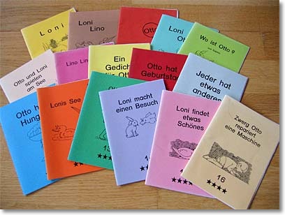 Diese 16 kleinen Bücher (DIN A6) mit farbigem Umschlag bieten Lesetexte in verschiedenen Schwierigkeitsstufen an.
